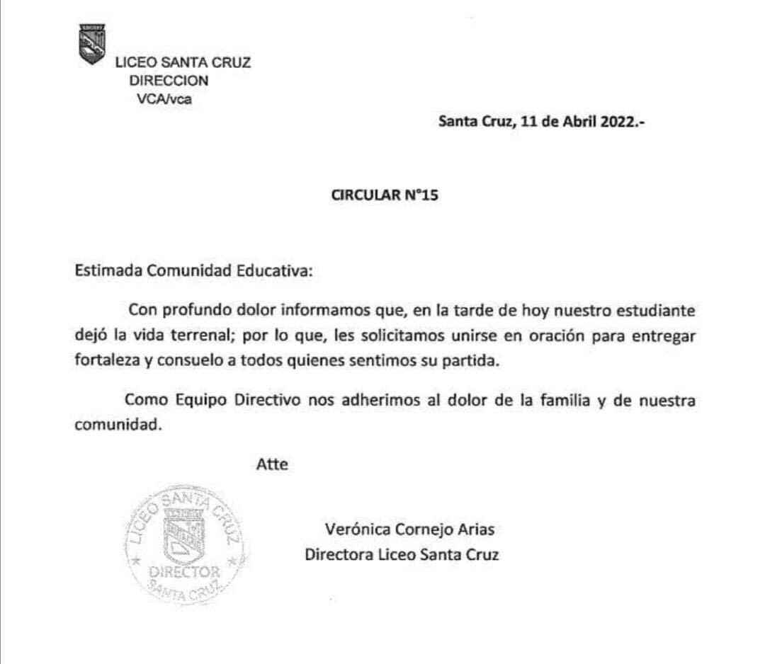 “Como Equipo Directivo nos adherimos al dolor de la familia y de nuestra comunidad”, cierra la circular.