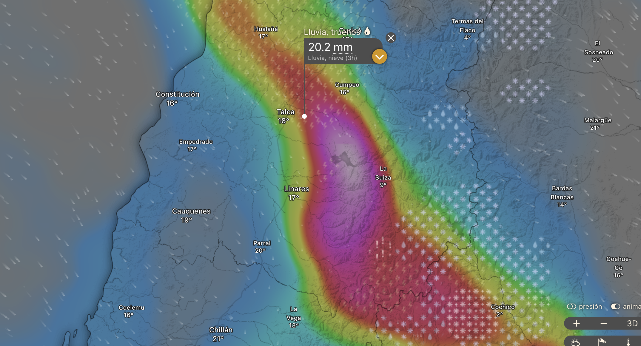 En este bloque horario, se estima que la intensidad de las precipitaciones podría alcanzar registros de 15 a 25 mm en solo 3 a 6 horas, una densidad que suele poner a prueba la capacidad de los sumideros y colectores de aguas lluvia en sectores críticos de Talca, como los pasos bajo nivel y la zona céntrica.