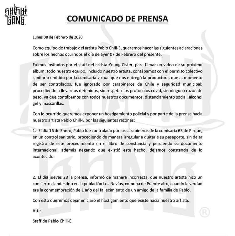 “Fuimos invitados por el staff del artista Young Cister, para filmar un video de su próximo álbum; todo nuestro equipo, incluido nuestro artista, contábamos con el permiso colectivo sanitario emitido por la comisaría virtual que nos entregó la productora, que al momento de ser controlados, fue ignorado por Carabineros de Chile y seguridad municipal”, partió diciendo el comunicado.