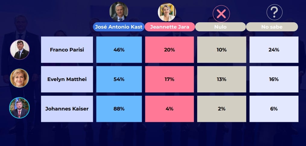 En el detalle sobre el origen de los apoyos, Kast sería el receptor de la mayoría de los votos que respaldaron a Franco Parisi, con un 46%. Similar situación ocurriría con los votos de Evelyn Matthei (54%) y Johannes Kaiser (88%).