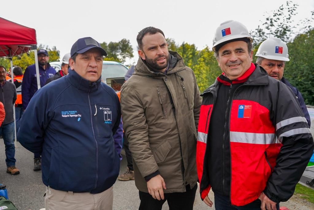 Delegado presidencial regional, Humberto Aqueveque Díaz; el subsecretario de Defensa, Ricardo Montero, y el director nacional de Vialidad, Horacio Pfeiffer, revisaron la construc-ción del rocaplén en el acceso sur del viaducto.