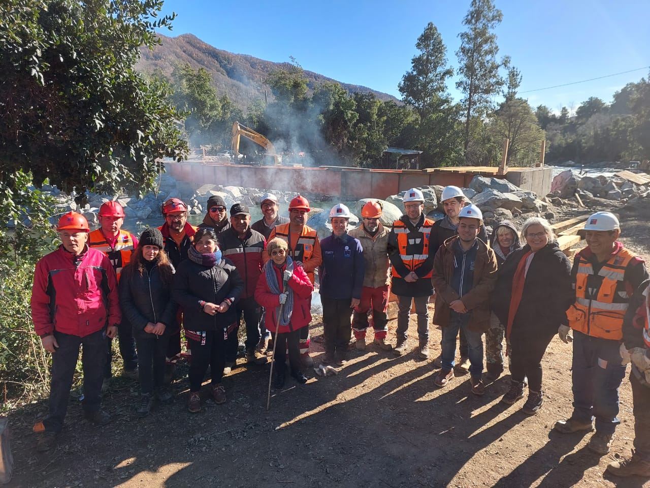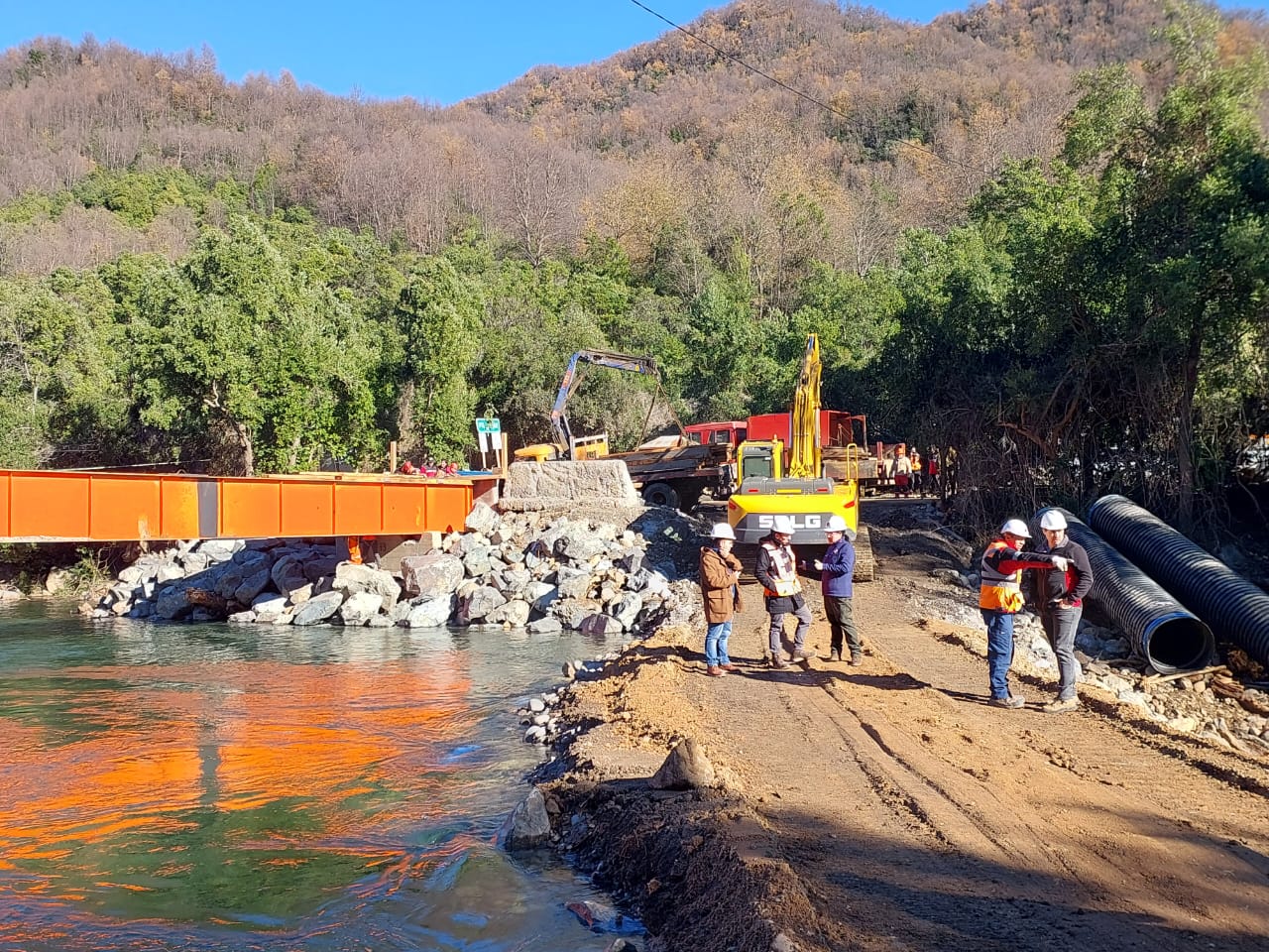 45 kilómetros al oriente de la ciudad de Parral, en las cercanías del embalse Bullileo, personal de la administración directa de la Dirección de Vialidad del Ministerio de Obras Públicas (MOP) trabaja en la reconstrucción del puente Vejar, el cual colapsó con los temporales de 2023.