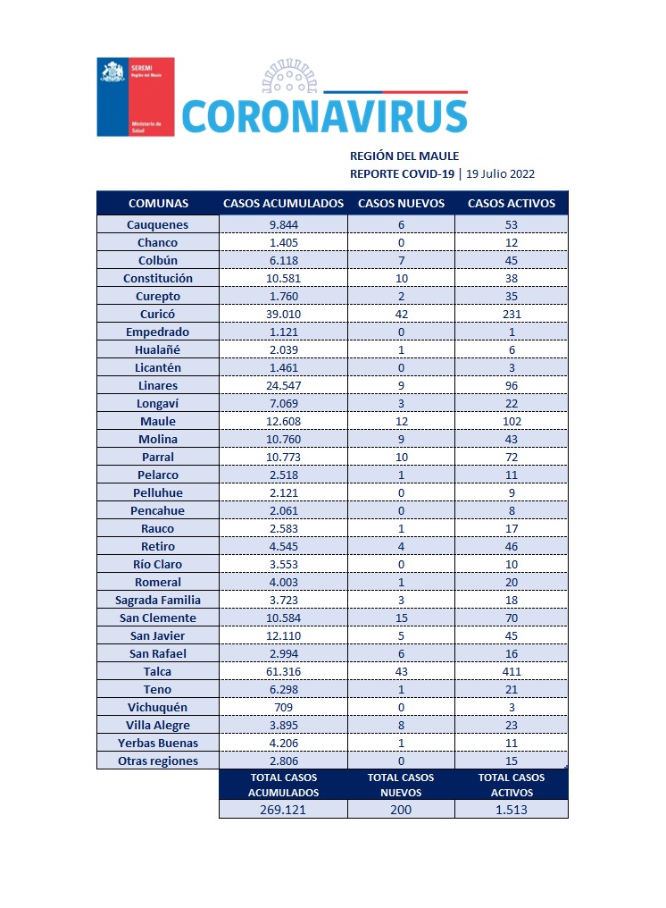 La seremi de Salud del Maule confirma 200 nuevos casos de Covid-19 para el informe de hoy.