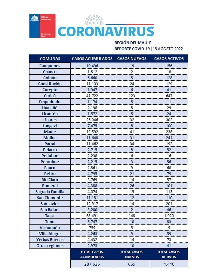 En un nuevo informe sobre la situación del Covid-19 en el Maule, desde la Seremi de Salud expusieron que en las últimas horas se registraron 669 nuevos casos, de los cuales 389 presentaron síntomas y 47 fueron asintomáticos. Lo anterior, deja un total de 287.625 personas diagnosticadas con la enfermedad en la región desde que comenzó la pandemia. Con respecto a los fallecidos, se contabilizaron dos nuevos decesos, por lo que la cifra total de muertos aumentó a 3.044.