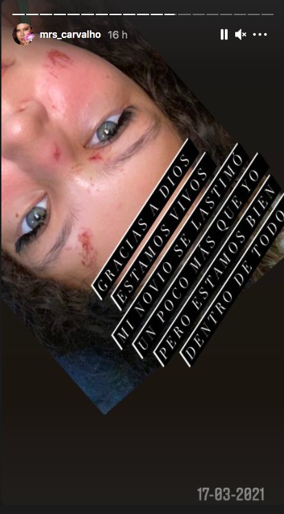 Así lo detalló la misma modelo a través de sus historias donde también mostró algunas de las lesiones que sufrió en su rostro, rodilla y tobillos. A su vez, mostró una fotografía de cómo quedó el vehículo el cual terminó con toda la parte delantera destruida.