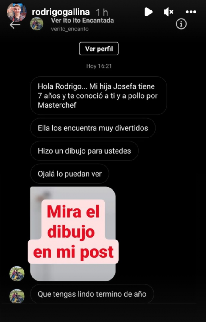 En sus historias de 'Instagram', Áviles compartió la captura de pantalla de una conversación que tuvo con la madre de la pequeña. Ahí, ella le comentó: "Mi hija Josefa tiene siete años y te conoció a ti y a Pollo por 'MasterChef'. Ella los encuentra muy divertidos. Hizo un dibujo para ustedes".