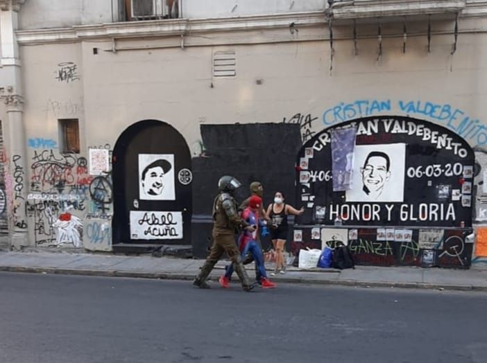 Hace pocos minutos CARABINEROS DETIENEN al “Sensual Spiderman”, quien se encontraba en una intervención pacífica en el memorial a Mauricio Fredes, en las cercanías de Plaza de la Dignidad.